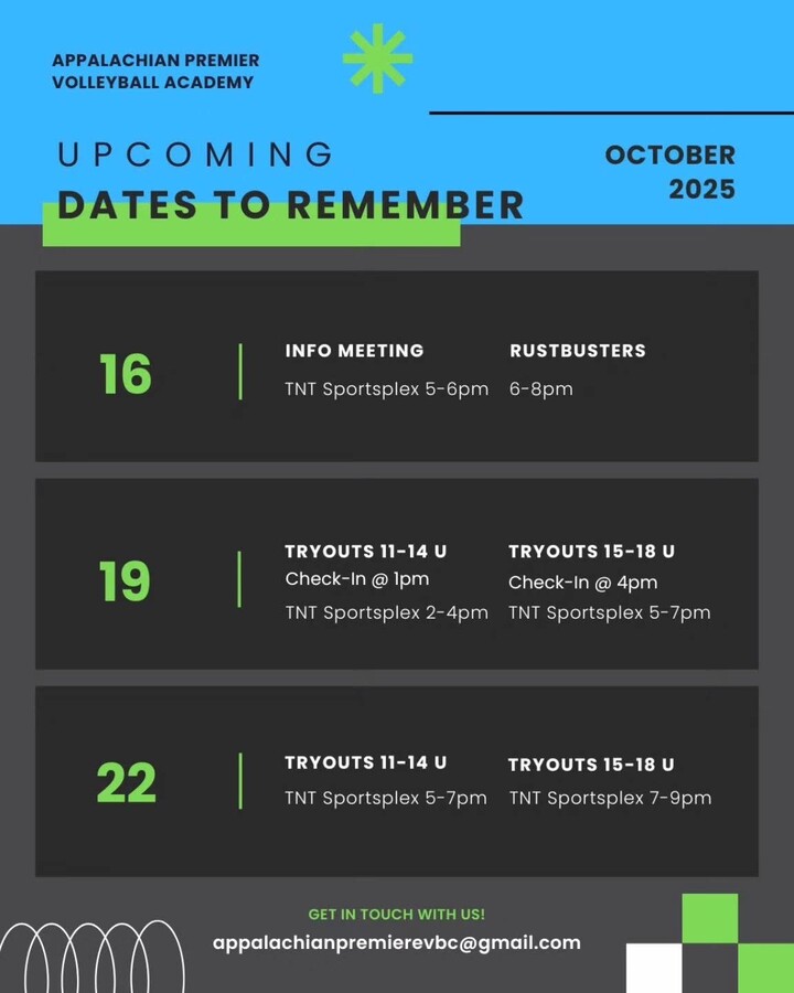 Oct 14 – Exciting News from Appalachian Premier Volleyball Academy! Get ready, volleyball fans and families—APVA is gearing up for an action-packed season, and we want YOU to be part of it!